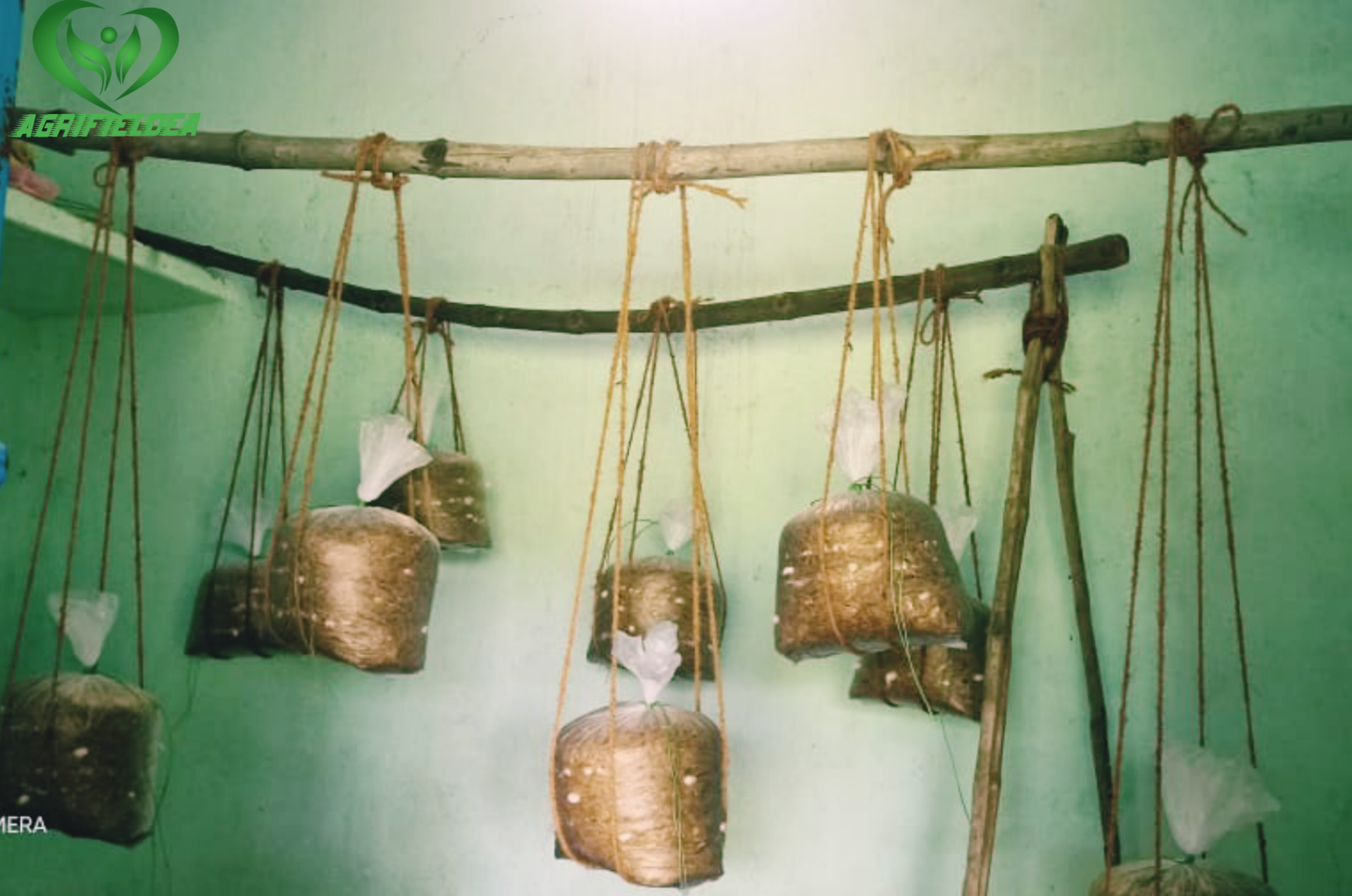 ◆ अब इस बीजाई की हुई तैयार बैग को एक साफ सुथरे कमरे में टेबल पर या लकड़ी के तख्ते या इसे रस्सी से चारो तरफ बांधकर निश्चित अन्तराल पर दूर – दूर  लटका सकते हैं ।